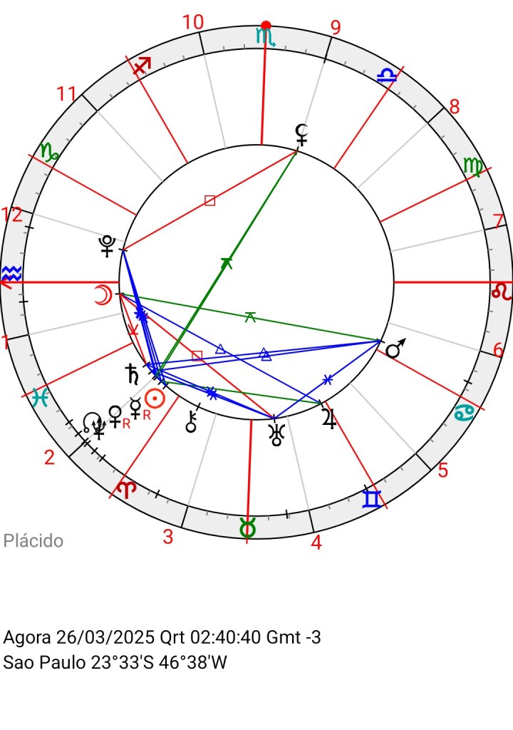 Visto a partir da Terra, o ciclo se encontra em fase de finalização segundo a posição da Lua (emoções ) Negra em Aquário e Marte (iniciativa) em Câncer.