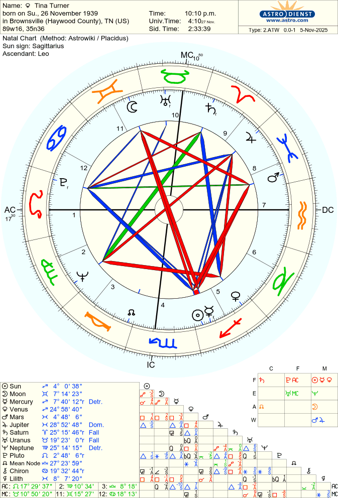 Aqui você encontra correlação entre o mapa de nascimento de Tina Turner e alguns fatos de vida encontrados na internet.