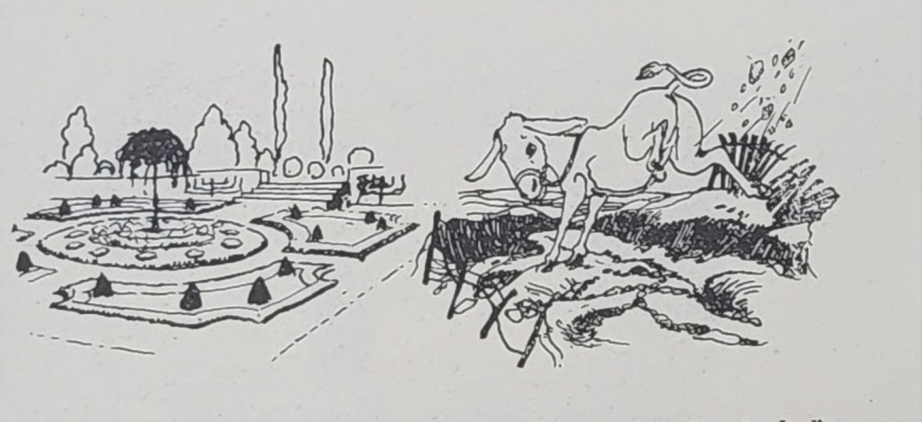 De um lado um jardim bem planejado, bem cultivado e florido; do outro, um jardim inculto, semelhante a uma ravina, com a cerca derrubada no qual um burro, com freio, embora livre, corre por aí, lançando terras e pedras pelo ar.” Fonte: 360 Degrés du Zodiaque.